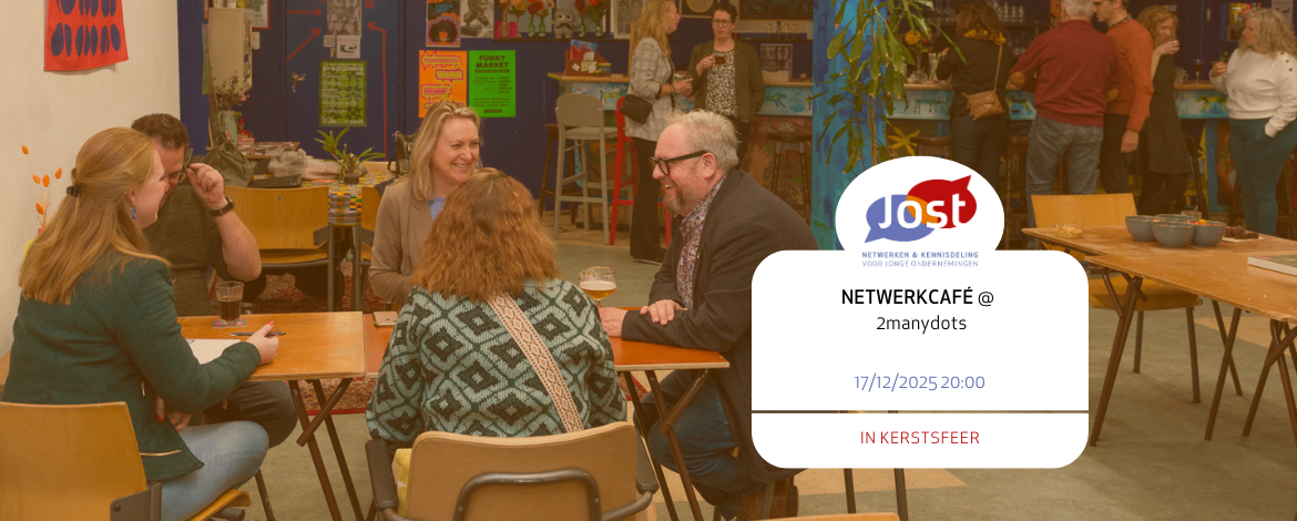 JOST is dè ontmoetingsplaats van en voor jonge ondernemingen uit Tilburg en omgeving. De vereniging organiseert regelmatig interessante bijeenkomsten over relevante thema’s die te maken hebben met ondernemen en verkopen. Denk aan marketing, acquisitie, communicatie, bedrijfsontwikkeling en financiën en administratie. JOST is dus een bron van kennis en ervaring. Benieuwd wat er de komende periode gepland staat? Bekijk de agenda.