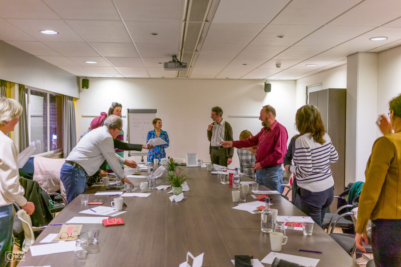 Een bijzondere oefening die we doen is het in tweetallen elkaar in het linkeroog, het oog van de ziel, aankijken. Daarbij proberen we aan te voelen, zonder dit uit te spreken, waar de ander op het moment mee bezig is. En dat leverde verrassende inzichten op. Want zegt Marjolein, vanuit je kwetsbaarheid kun je een echte connectie maken.