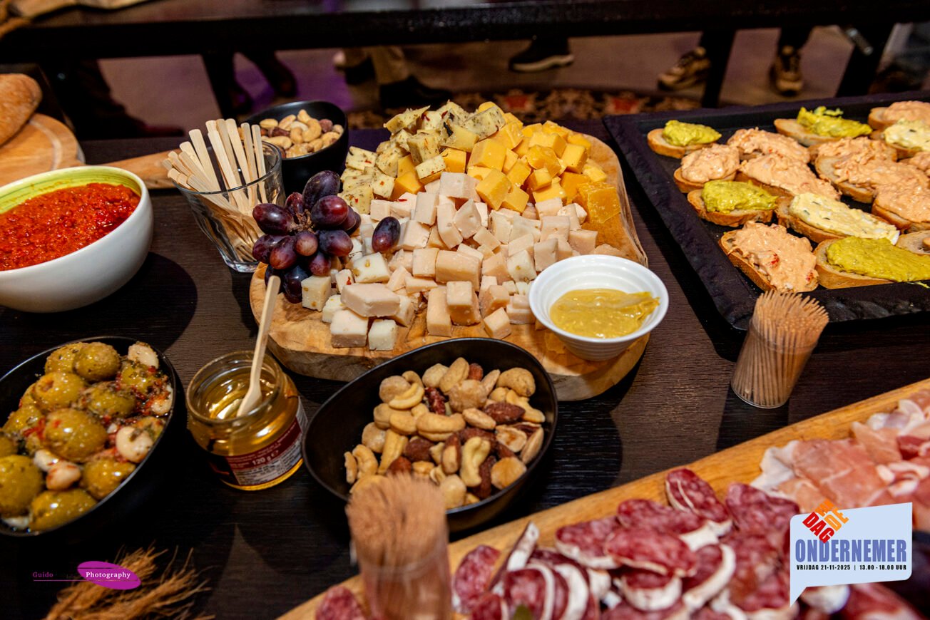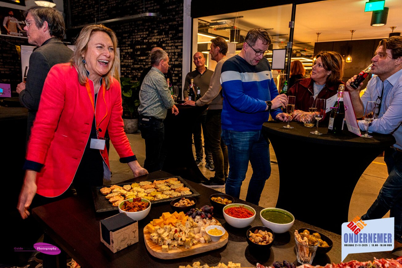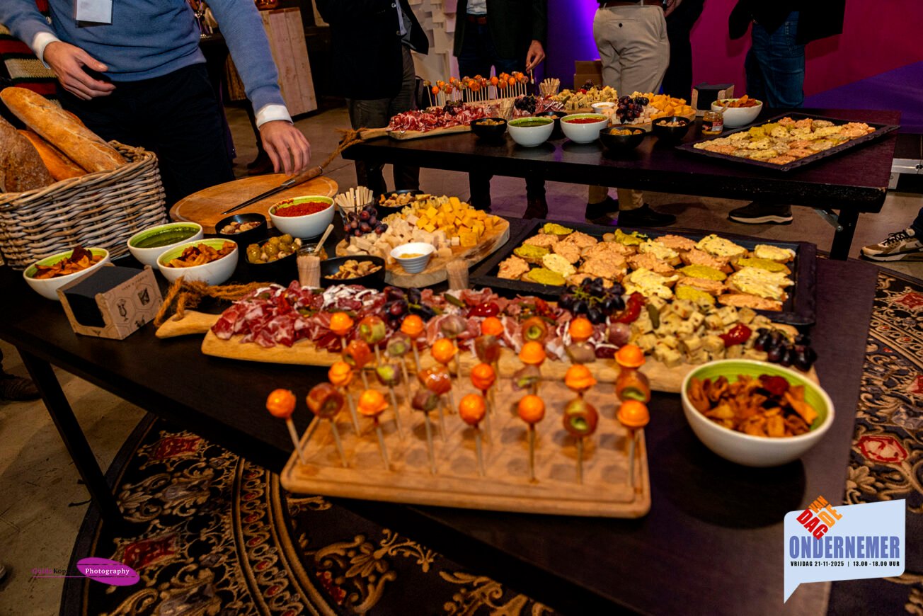 Daarna kon de borrel echt beginnen. Zeker na het binnendragen van 2 tafels boordevol heerlijke borrelhapjes van Josjes Culinair. In een zeer ontspannen sfeer wordt er volop geborreld en genetwerkt. En toch komt aan deze zeer gezellige en energieke Dag van de Ondernemer 2025 een einde.
