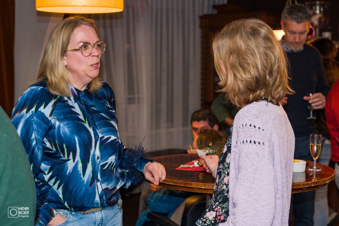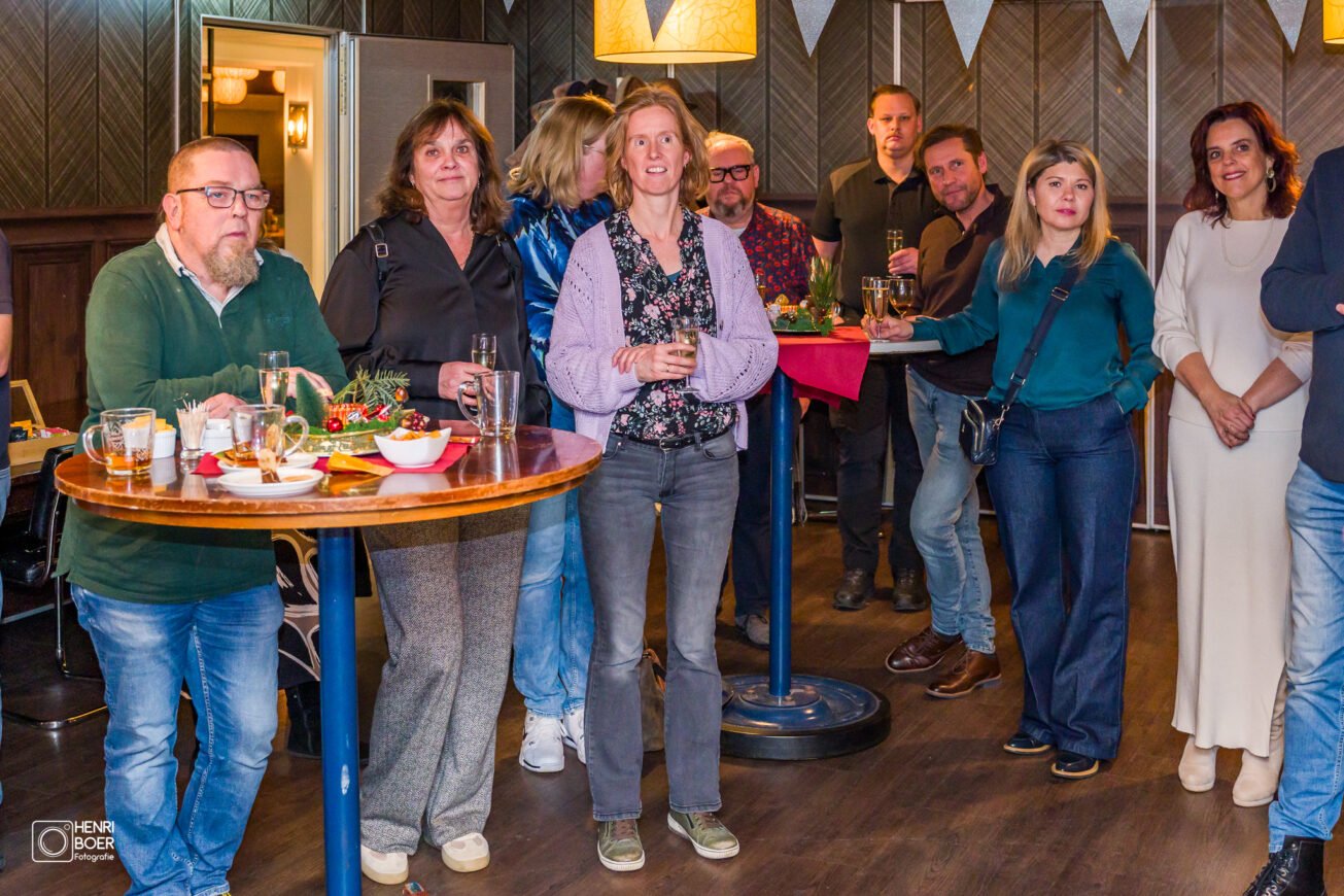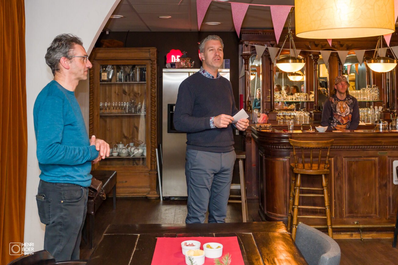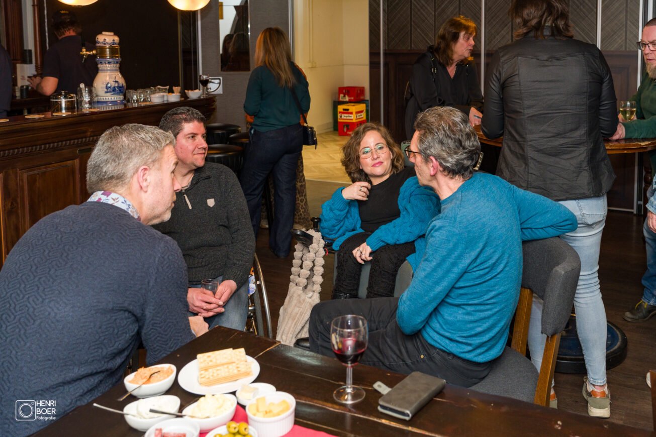 Daarna gaat het netwerken weer verder. Onafgemaakte gesprekken worden voortgezet of nieuwe gesprekken worden gestart. Zo werkt dat met netwerken (ook in een kroeg overigens). Ondertussen worden er bakjes op tafel gezet met luxe hapjes. Blokjes kaas, stukken brie, worst, salade en toastjes. Er wordt vanuit Den Herdgang hard gewerkt, om te zorgen dat we niets tekort komen, ook door regelmatig te vragen of we nog iets te drinken willen.