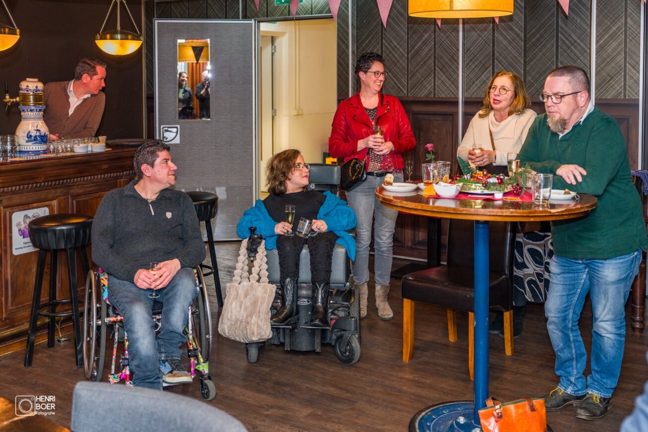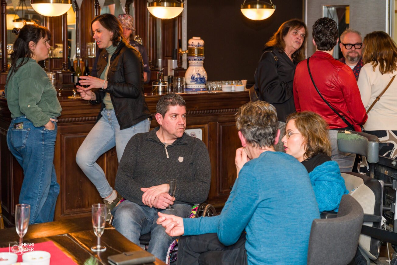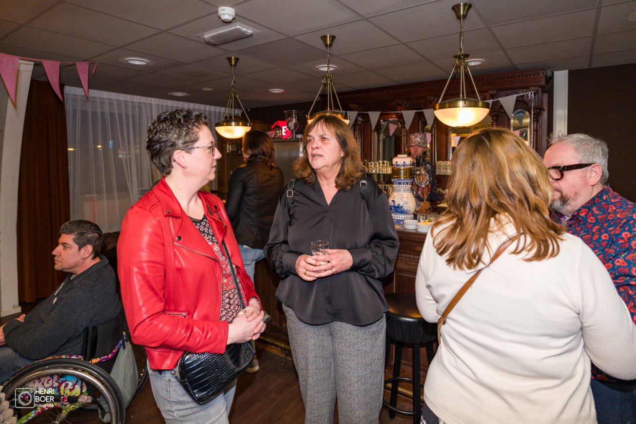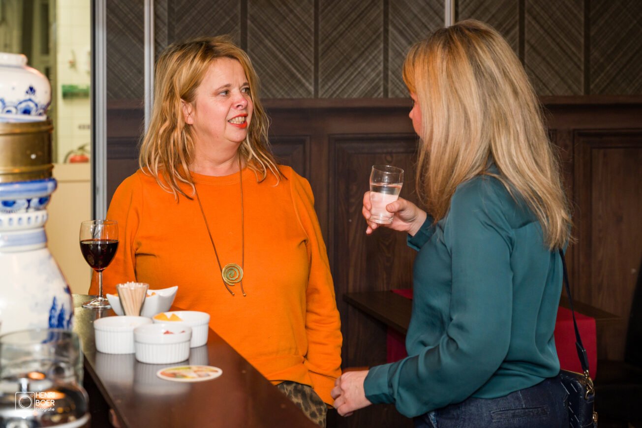 Daarna gaat het netwerken weer verder. Onafgemaakte gesprekken worden voortgezet of nieuwe gesprekken worden gestart. Zo werkt dat met netwerken (ook in een kroeg overigens). Ondertussen worden er bakjes op tafel gezet met luxe hapjes. Blokjes kaas, stukken brie, worst, salade en toastjes. Er wordt vanuit Den Herdgang hard gewerkt, om te zorgen dat we niets tekort komen, ook door regelmatig te vragen of we nog iets te drinken willen.